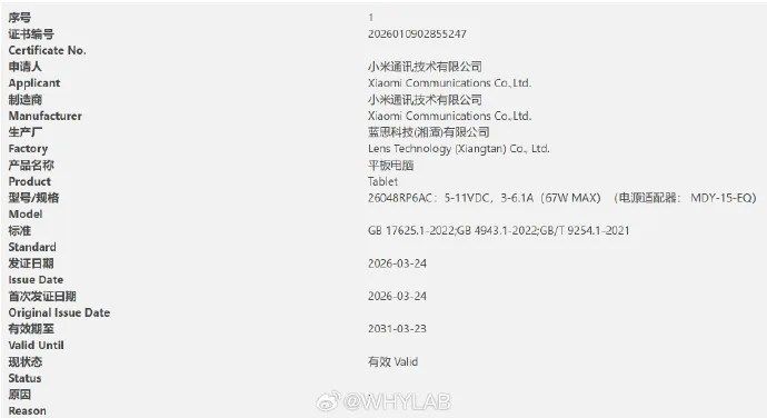 وحصل هذا الحاسوب المبتكر مؤخراً على الاعتمادات الرسمية داخل الصين مما يمهد الطريق لاقتراب موعد إطلاقه الرسمي. وظهر الجهاز في قوائم الشهادات التقنية تحت رقم الطراز 26048RP6AC لتأكيد جاهزيته، وكشفت هذه التسريبات الموثوقة عن دعم الحاسوب لتقنية الشحن السلكي السريع بقدرة تبلغ 67 واطاً ليحافظ بذلك على نفس سرعة الشحن الممتازة التي تواجدت في الجيل السابق دون أي تغييرات جذرية في هذا الجانب التكنولوجي المهم.